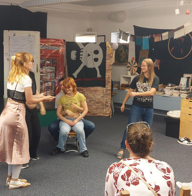 Am 26. April feierten wir nach nur sechs Tagen des intensiven Werkelns und Spielens eine sagenhafte Premiere unserer eigenen Interpretation des Grimms-Märchens "Hänsel und Gretel". Wir analysierten die alte Geschichte um finanzielle und menschliche Nöte und setzten sie ins Hier und Jetzt. Wir spielten mit traditionellen Rollenbildern und entwarfen drei unterschiedliche Familienbiografien. Wir thematisierten Kindeswohlgefährdung, Personalnot beim Jugendamt, Sozial- und Familienpolitik und die vielen kleinen und großen Lügen der Familien, um den gesellschaftlichen Erwartungen gerecht zu werden. Vor dem versöhnlichen Finale ermahnte Gretel höchstpersönlich das Publikum, den Kindern richtig zuzuhören, "denn Kinder sind schließlich auch Menschen!"