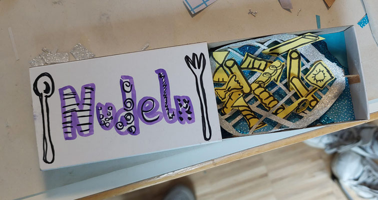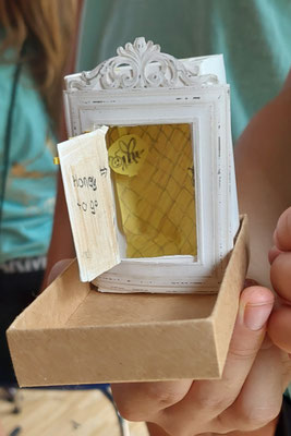 Unsere mobile Schreib- Stempel- und Wortwerkstatt lud mit dem Bilderbuch "Die zauberhafte Wortverlosung" von Jutta Degenhardt und Lars Baus (Mixtvision) Kinder, Jugendliche und Erwachsene zum Kreativwerden ein. Worte wurden verlost und zu Miniatur-Erlebniswelten in Streichholzschachteln. Mit dem fertigen Wortschatzkästchen konnte man dann auf dem Platz vor der St. Bernhard-Kirche auf eine kleine Weltreise gehen, um sich das Wort in viele Sprachen übersetzen zu lassen.