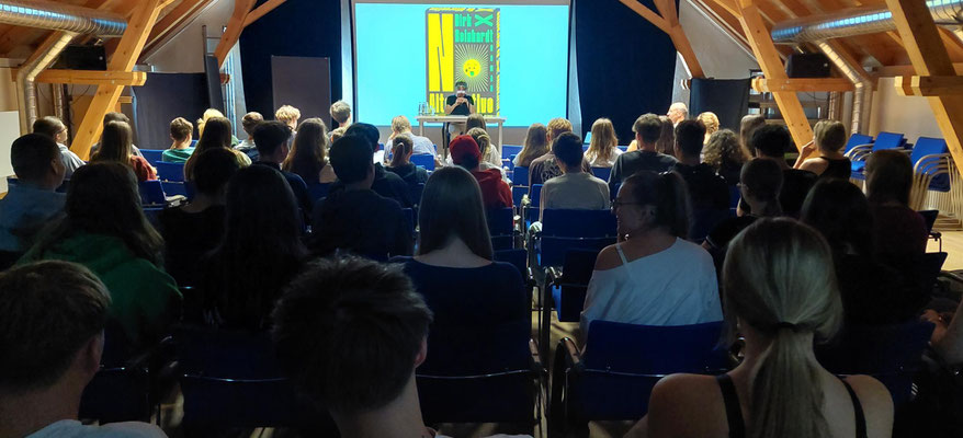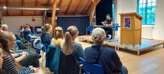 Mit drei Lesungen begeisterte Dirk Reinhardt am 15. Juli 2025 fünf Schulklassen am Vormittag und zahlreiche Gäste in einer öffentlichen Veranstaltung am Nachmittag. Überzeugend, informativ und manchmal provokativ präsentierte uns der bekannte Autor Fakten und Hintergrundwissen zur Klimaproblematik und zu seinem hochaktuellen Ökothriller.